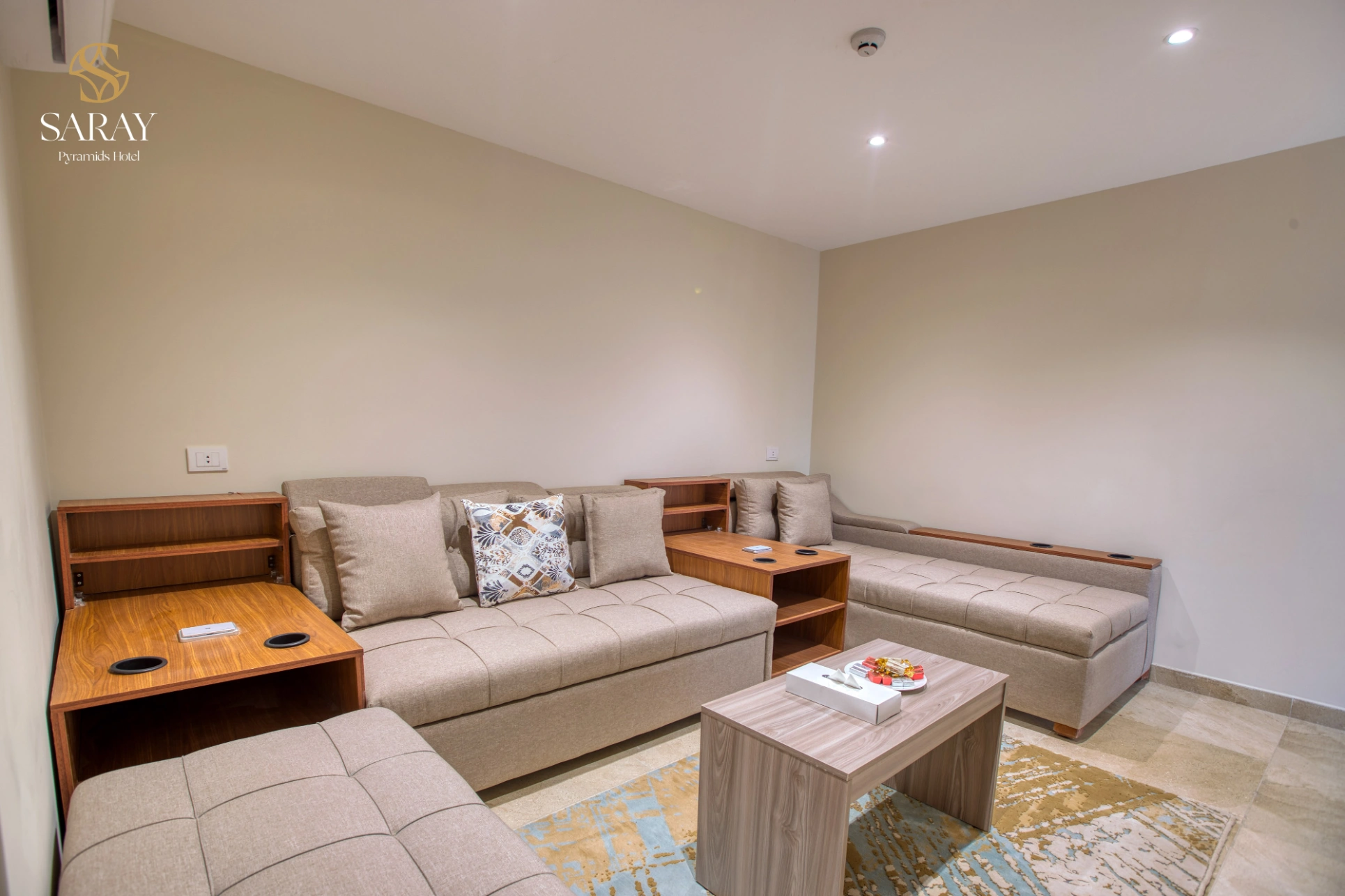 Amenities: Separate living room, sofa bed, air conditioning, TV, view of pyramids and museum